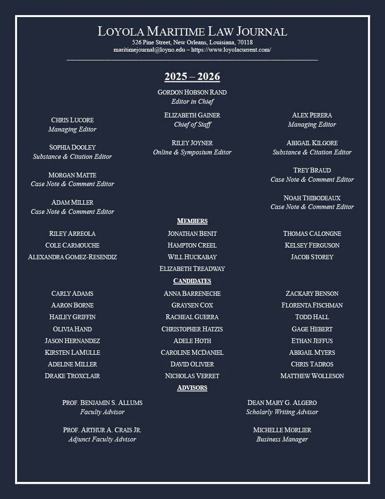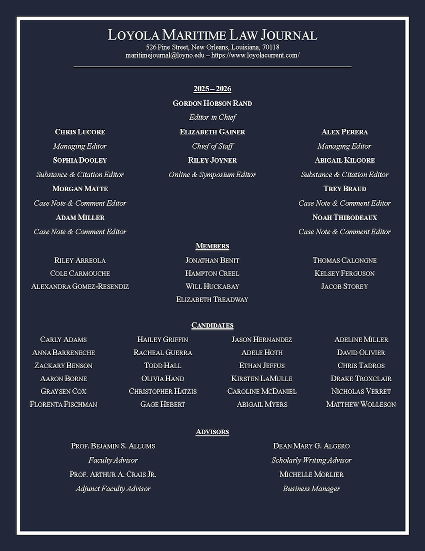 The Current serves as the blog of the Loyola Maritime Law Journal, where we update our on the latest developments within maritime, environmental, international, and space law. As a counterpart to the Journal’s biannual publication, the Current offers readers monthly insights into the constantly evolving realm of maritime law. The Current informs readers about the Journal’s progress both on campus and in practice, including information about our biannual publication and awards received by students. The Current’s posts are written by the Journal’s members and candidates, as well as by practitioners, judges, and academics. If you would like to contribute to the Current’s rich legacy, please enter your information in the “Submissions” heading.